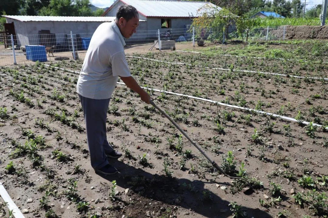 走進內(nèi)蒙古興安盟扎賚特旗巴達爾胡鎮(zhèn)寶日索格社區(qū)劉根柱家,只見院落整潔干凈、房屋窗明幾凈,庭院東側(cè)種植著豆角、茄子、黃瓜等種類繁多的蔬菜,西側(cè)則種植著蒼術(shù),作物外圍的白色護欄更顯院落整體整潔明朗。
