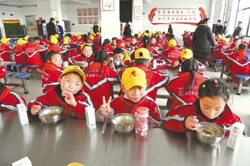圖為那曲市聶榮縣第二完全小學(xué)的孩子們?cè)趯W(xué)校吃晚飯。本報(bào)記者 李洲 攝