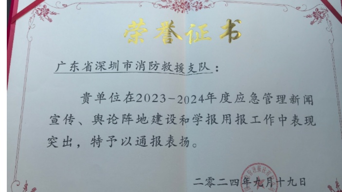 深圳消防連續(xù)四年榮獲“全國應(yīng)急管理新聞宣傳暨學(xué)報用報先進單位”稱號。