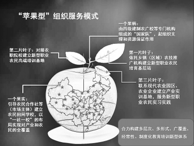 農(nóng)民教育培訓(xùn)最大的問題是組織問題,創(chuàng)新農(nóng)民教育培訓(xùn)模式,首先要?jiǎng)?chuàng)新農(nóng)民教育培訓(xùn)組織方式,有效破解教育培訓(xùn)“低水平簡(jiǎn)單重復(fù)”和“搞培訓(xùn)不抓隊(duì)伍”問題。農(nóng)廣校堅(jiān)持開放的大體系觀,創(chuàng)新機(jī)制模式打造資源集合平臺(tái),推進(jìn)專門機(jī)構(gòu)、相關(guān)資源和市場(chǎng)主體三種力量結(jié)盟,探索建立政府部門統(tǒng)籌領(lǐng)導(dǎo)下的新型職業(yè)農(nóng)民教育培訓(xùn)“蘋果型”組織服務(wù)方式。“一個(gè)果柄”是作為“國(guó)家隊(duì)”的專門機(jī)構(gòu)。由中央、省、市、縣四級(jí)建制農(nóng)廣校組成,起組織支撐和資源保證作用。“三片葉子”是相關(guān)資源的有序高效利用。“第一片葉子”是依托鄉(xiāng)鎮(zhèn)(區(qū)域)農(nóng)技推廣機(jī)構(gòu)建立新型職業(yè)農(nóng)民培育基層站,將專門機(jī)構(gòu)的組織支撐和資源保證作用進(jìn)一步向鄉(xiāng)鎮(zhèn)(區(qū)域)延伸;“第二片葉子”是對(duì)接農(nóng)職院校建立培養(yǎng)基地,提供新型職業(yè)農(nóng)民高端培訓(xùn)和高職教育;“第三片葉子”是聯(lián)系現(xiàn)代農(nóng)業(yè)園區(qū)、農(nóng)業(yè)企業(yè)建立產(chǎn)業(yè)實(shí)訓(xùn)基地,服務(wù)新型職業(yè)農(nóng)民實(shí)習(xí)實(shí)踐。“一個(gè)果實(shí)”是作為市場(chǎng)主體的新型農(nóng)業(yè)經(jīng)營(yíng)主體。引導(dǎo)農(nóng)民合作社等建立農(nóng)民田間學(xué)校,以“一社一校”的布局實(shí)現(xiàn)對(duì)產(chǎn)業(yè)和農(nóng)民的全覆蓋。“蘋果型”有機(jī)統(tǒng)一體,把政府部門的統(tǒng)籌主導(dǎo)職能、專門機(jī)構(gòu)的支撐保證作用、相關(guān)資源的有序高效利用機(jī)制導(dǎo)入市場(chǎng)主體,共同培育和服務(wù)新型職業(yè)農(nóng)民。