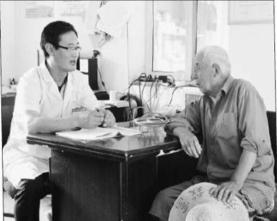 11點,上午的病人終于看完。施震林伸伸腰,趴在桌子上休息5分鐘后,又拿起了血壓監(jiān)測儀,準備動身。“按計劃,今天要去上莊村。”施震林說,“最近天氣太熱,村里有幾位老人身體不好,我過去看一下。”