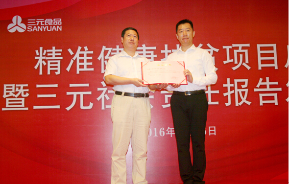河北省扶貧基金會秘書長李士宏向三元食品奶粉事業(yè)部總經(jīng)理吳松航頒發(fā)榮譽證書。