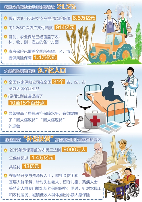 事實(shí)上,在當(dāng)前各種支持“三農(nóng)”建設(shè)的力量中,保險(xiǎn)業(yè)是主力之一。數(shù)據(jù)顯示,2016年1月份到11月份,農(nóng)業(yè)保險(xiǎn)原保險(xiǎn)保費(fèi)收入為390.49億元,同比增長11.18%。“十二五”時(shí)期,我國農(nóng)業(yè)保險(xiǎn)業(yè)務(wù)年均增速達(dá)21.2%,農(nóng)業(yè)保險(xiǎn)累計(jì)為10.4億戶次農(nóng)戶提供風(fēng)險(xiǎn)保障6.5萬億元,向1.2億戶次農(nóng)戶支付賠款914億元。特別是2007年到2015年間,農(nóng)業(yè)保險(xiǎn)業(yè)務(wù)規(guī)模增長迅猛,年均保費(fèi)增長率高達(dá)51.65%。