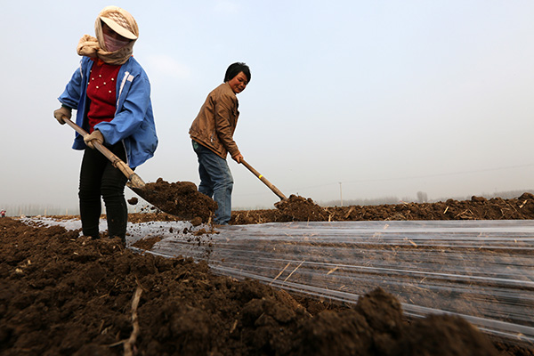 2月19日,在山東省郯城縣民樂種植農民專業合作社種植基地,工人為種植的土豆覆膜。