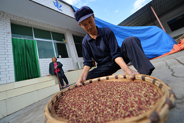 甘肅省隴南市武都區(qū)漢王鎮(zhèn)花椒種植戶楊云開在篩花椒,他的花椒將賣給當?shù)匾患乙噪娚谭绞竭\營的花椒專業(yè)合作社(2015年10月10日攝)。