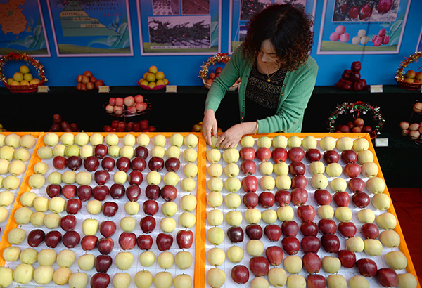 在甘肅省隴南市禮縣蘋果產(chǎn)銷電商洽談對接會上,一名工作人員在布置漢字造型的蘋果展臺(2015年9月25日)。