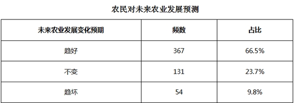 數據顯示,有66.5%的受訪者認為未來農業發展趨好;23.7%的受訪者認為未來農業發展趨勢不變;只有9.8%的受訪者認為未來農業發展趨壞。