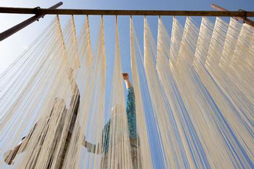 中江掛面制作原料十分考究,制作工藝精妙絕倫。民國1931年版《中江縣志》記載:“中江掛面,面細如絲,長八九尺,截兩頭,取中段,名曰腰面,又稱銀絲面,縣城內外俱佳,河西譚家街尤盛。色白味甘,食之柔滑,細而中空,堪稱潔、白、凈、干、細五絕……”關于制作工藝,有史料記載:“中江掛面特色的形成,除有得天獨后的原料、水質和氣候條件外,主要還在于有技藝精湛的工匠和嚴格的工藝規范。它以專制面粉為原料,以豆粉、精鹽、香油為輔料,通過和(面)粉、開大小條、上棍、撲面、定條、干燥、切面、包裝等八道主要工序,歷時十六小時精制而成”。