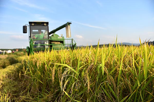 9月20日,在安徽涇縣晏公鎮,農民駕機收割水稻。