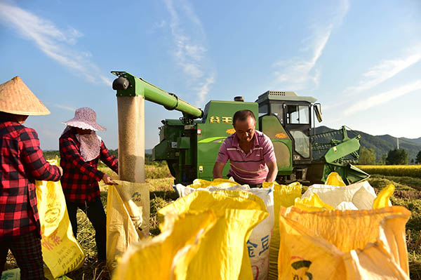 9月20日,在安徽涇縣晏公鎮,農民將剛收割的水稻裝袋。