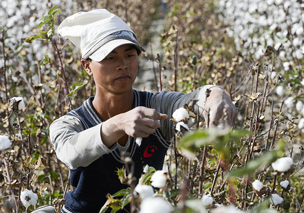 在新疆阿瓦提縣豐收三場(chǎng)的一處棉田里,來自重慶的何先培正在采摘長(zhǎng)絨棉(10月24日攝)。