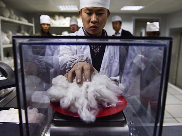 在新疆阿瓦提縣豐收三場(chǎng)的一個(gè)實(shí)驗(yàn)室里,工作人員正在對(duì)新購(gòu)的棉花進(jìn)行檢測(cè)評(píng)級(jí)(10月24日攝)。