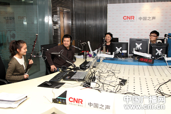本期《中國大舞臺》節目嘉賓中央音樂學院附中校長娜木拉(右二),從附中走出的青年鋼琴家王笑寒(左二),附中高三學生章海玥(左一)與主持人胡凡交流(中廣網記者涂傲攝)