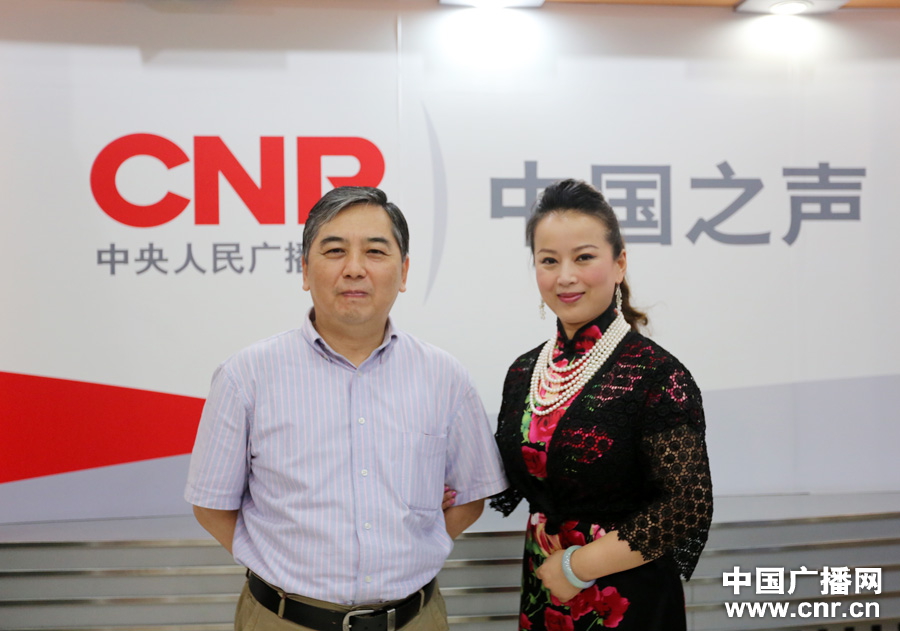 北京京劇院青年演員王奕謌(王奕戈)與中國戲劇家協會副秘書長崔偉做客《中國大舞臺》(中廣網 張曈攝)