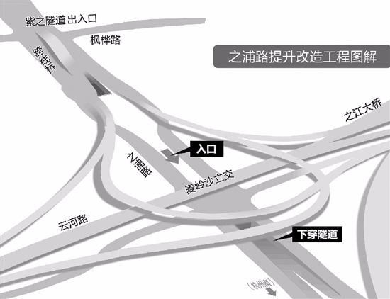 “之浦路云河路的這個位置很特別,目前分了兩層,上面的一層,是之江大橋和各條道路相連的麥嶺沙立交,下面一層是地面道路。如果再往上做跨線橋,這個上跨的高度就非常高,除了施工難度大、造價不會低于隧道之外,還有最重要的一點,就是對周圍的城市景觀有一定程度的影響。”相關部門的負責人透露。