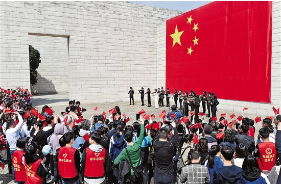 3月17日,文藝工作者在位于杭州余杭的良渚博物院深情朗誦、引吭高歌,以一場快閃活動帶動現場觀眾表達愛國心聲。(記者 潘海松 攝)