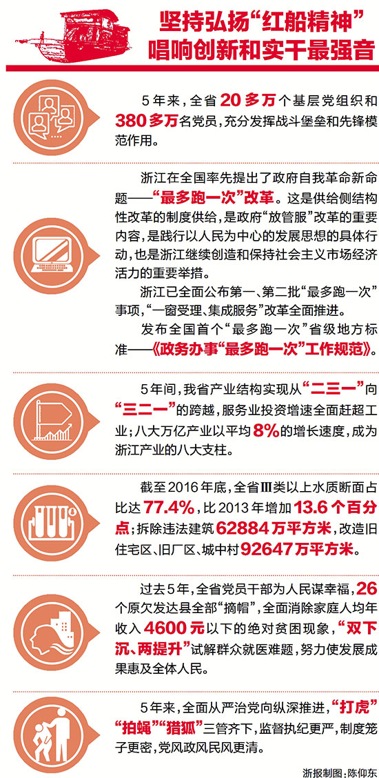 5年來,浙江深入貫徹習近平總書記系列重要講話精神和治國理政新理念新思想新戰略,沿著“八八戰略”指引的道路,在改革發展穩定、改善民生福祉、全面從嚴治黨等方面,取得了一系列具有重大現實意義和深遠歷史意義的成就,向著高水平全面建成小康社會邁出堅實步伐,在“兩富”“兩美”浙江建設道路上開辟新征程。