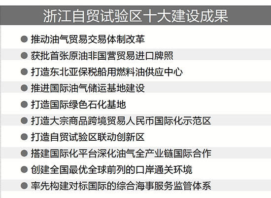 十大成果包括“推動油氣貿(mào)易交易體制改革”“獲批首張原油非國營貿(mào)易進口牌照”“打造東北亞保稅船用燃料油供應(yīng)中心”等。這些成果可謂含金量十足,以“推動油氣貿(mào)易交易體制改革”為例,浙江自貿(mào)試驗區(qū)率先實現(xiàn)了保稅油經(jīng)營領(lǐng)域全面開放,躍升為全國第一、全球第八大加油港。